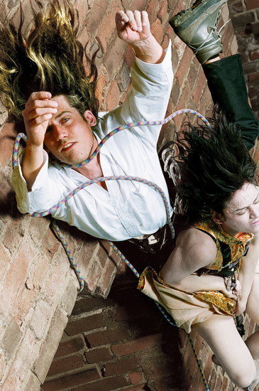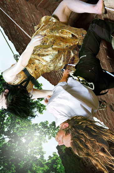 Caspar David Friedrich, Winterreise, 1831 “BURST” (dance movie). Director: Reynir Lyngdal. Choreography: Katrin Hall. ©2003 In the series “romantica”, historic and contemporary quotations of the Romantic period are used in a new story. The historic quotations here are based on a place stylized by Caspar David Friedrich into Romanticism. Through his paintings “Winterreise” and “Ruinen in der Abenddämmerung”, the cloister Altzella became an icon of Romantic picture conception. The contemporary quotations of the Romantic here are depiced in the form of alpinism as icon of the modern preparedness to take high risks and the yearning for new levels of experience on the one hand, as well as the escapism towards glamour on the other. The latter is visualized by the golden party dress from California, a symbol of Hollywood and star-cult, money and fame. With its risky acrobatics at the wall of the cloister, the performance symbolises the attempt of two people driven by diverse projections to come together. Likewise in the sense of the Romantic conception of love, love here results in a dramatic fall from the peaks of illusions and hangs itself, so to speak, in an ecstasy of the beautiful death. Realization: idea, production, director, accouterment: Yana Milev performance: Yana Milev, Sebastian Isinig dress: Golden 70th West-Coast Barbecue-Sampler shoes: NAVYBOOT equipment: Mammut (belt), Petzl (nylon rope) location: cloisterremains Altzella photos by Philipp Beckert |